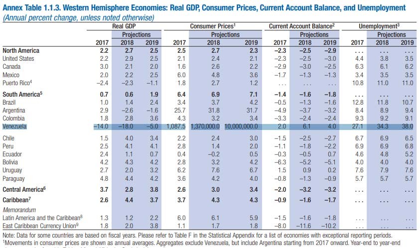 Hesabatda dünyanın ən böyük sübut olunmuş neft ehtiyatına malik Venesuela iqtisadiyyatının bu il 18 faiz, gələn il 5 faiz azalmasının gözləndiyi açıqlanıb.