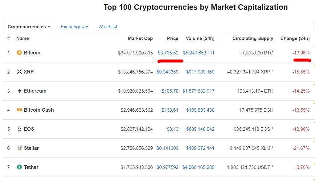 Bitcoin-in qiyməti 4 min dollardan da aşağı düşüb