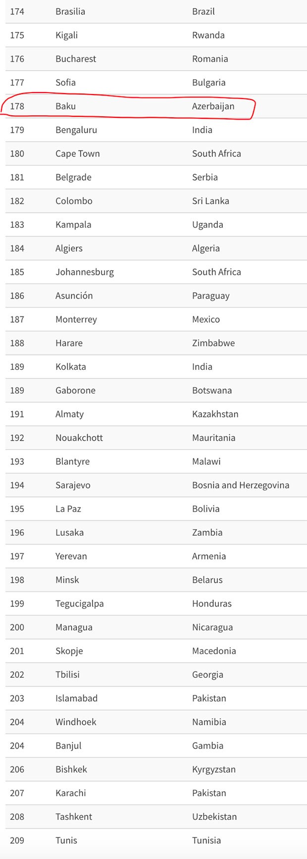 Azərbaycanın paytaxtı Bakı siyahıda 178-ci yerdədir. Bakı dünyada ən ucuz 31-ci şəhərdir.