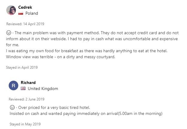 Digərləri isə ödəniş olunması üçün vaxt istədikləri halda, hotel administratorları tərəfindən səhər saat 5 olmasına baxmayaraq, dərhal ödəniş etməli olduqlarını bildiriblər. Ümumiyyətlə, ödənişlə bağlı bir çox ziyarətçilər rəylərdə öz şikayətlərini bölüşüblər. Belə ki, hoteldə qeyri-nağd ödəniş həyata keçirilməsi mümkün olmadığından turistləri kartlarındakı pulları dərhal nağdlaşdırmağa məcbur edirlər.