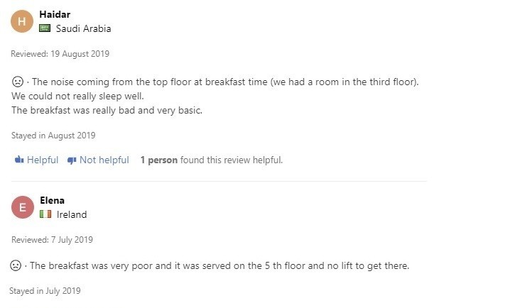 Otel sifarişi üzrə ixtisaslaşmış dünya üzrə məşhur booking.com saytında da sözügedən hotellə bağlı xeyli sayda xoşagəlməz rəy var. Belə ki, bu yay nömrə götürən turistlər səhər yeməyinin çox zəif olmasını, yemək verilən beşinci mərtəbədəki terrasa qalxmaq üçün isə liftin işləməməsini qeyd ediblər.