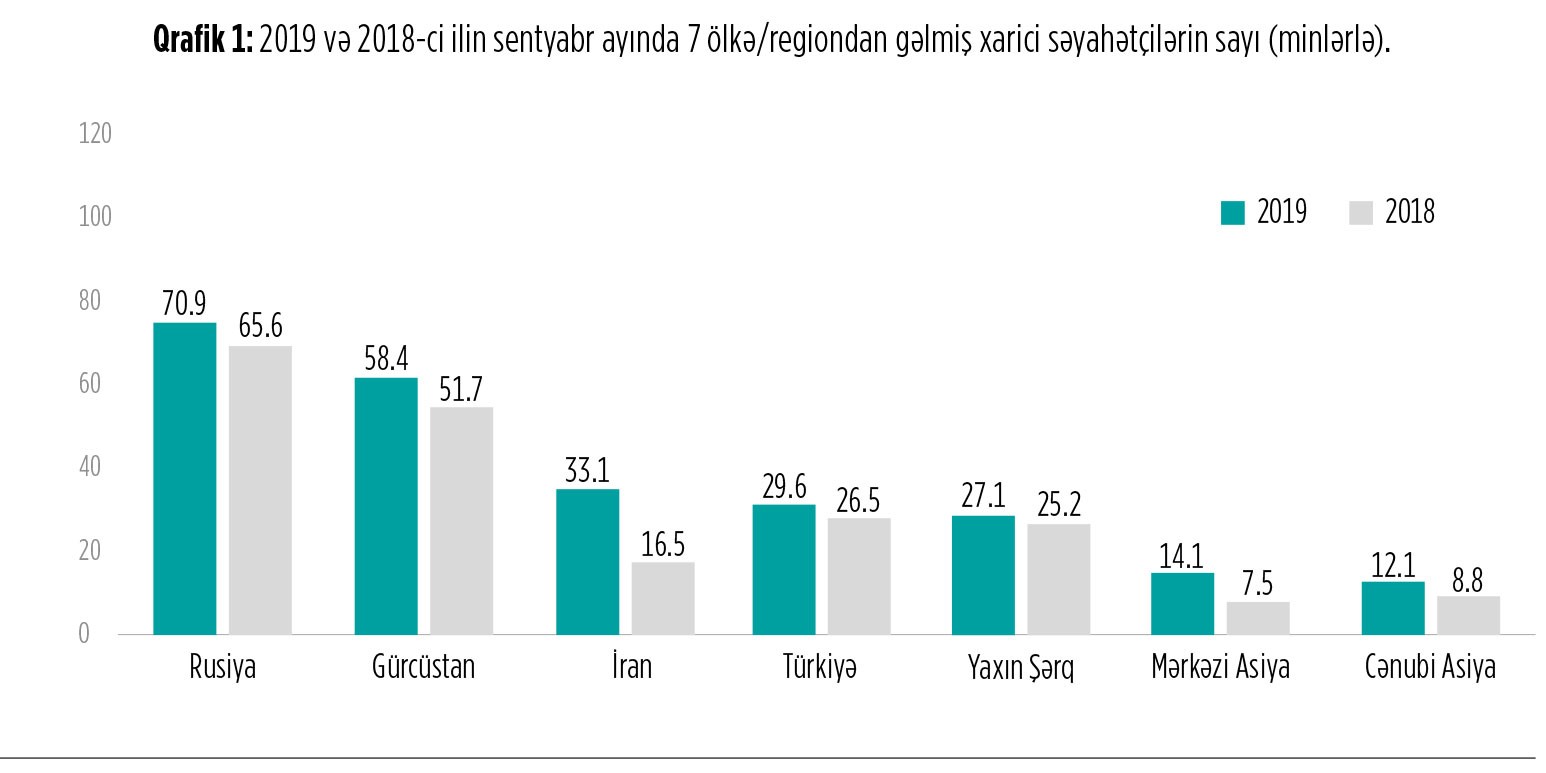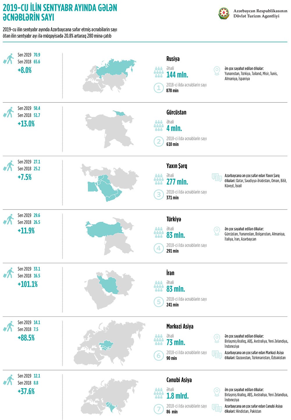 2019-cu ilin sentyabr ayında ümumilikdə 280 min nəfər Azərbaycan sərhədlərini keçib ki, bu da 2018-ci ilin sentyabr ayına nisbətən 48 min və ya 20.8% çox xarici vətəndaş deməkdir.