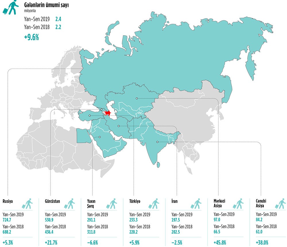 2019-cu ilin yanvar-sentyabr dövründə Azərbaycana gələn xarici qonaqların sayı keçən ilin eyni dövrü ilə müqayisədə 9.6% artaraq 2.4 milyona çatıb.