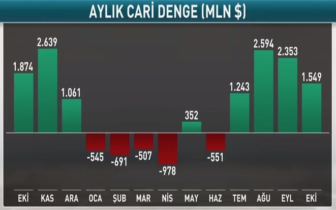Oktybar ayında Türkiyənin cari əməliyyatlar balansında 1.55 milyard dollar profisit (artıqlıq) yaranıb. Bunun nəticəsində, on iki aylıq cari əməliyyatlar profisiti 4 milyard 336 milyon dollar olub.
