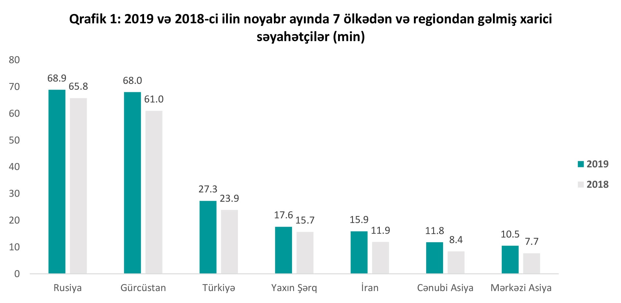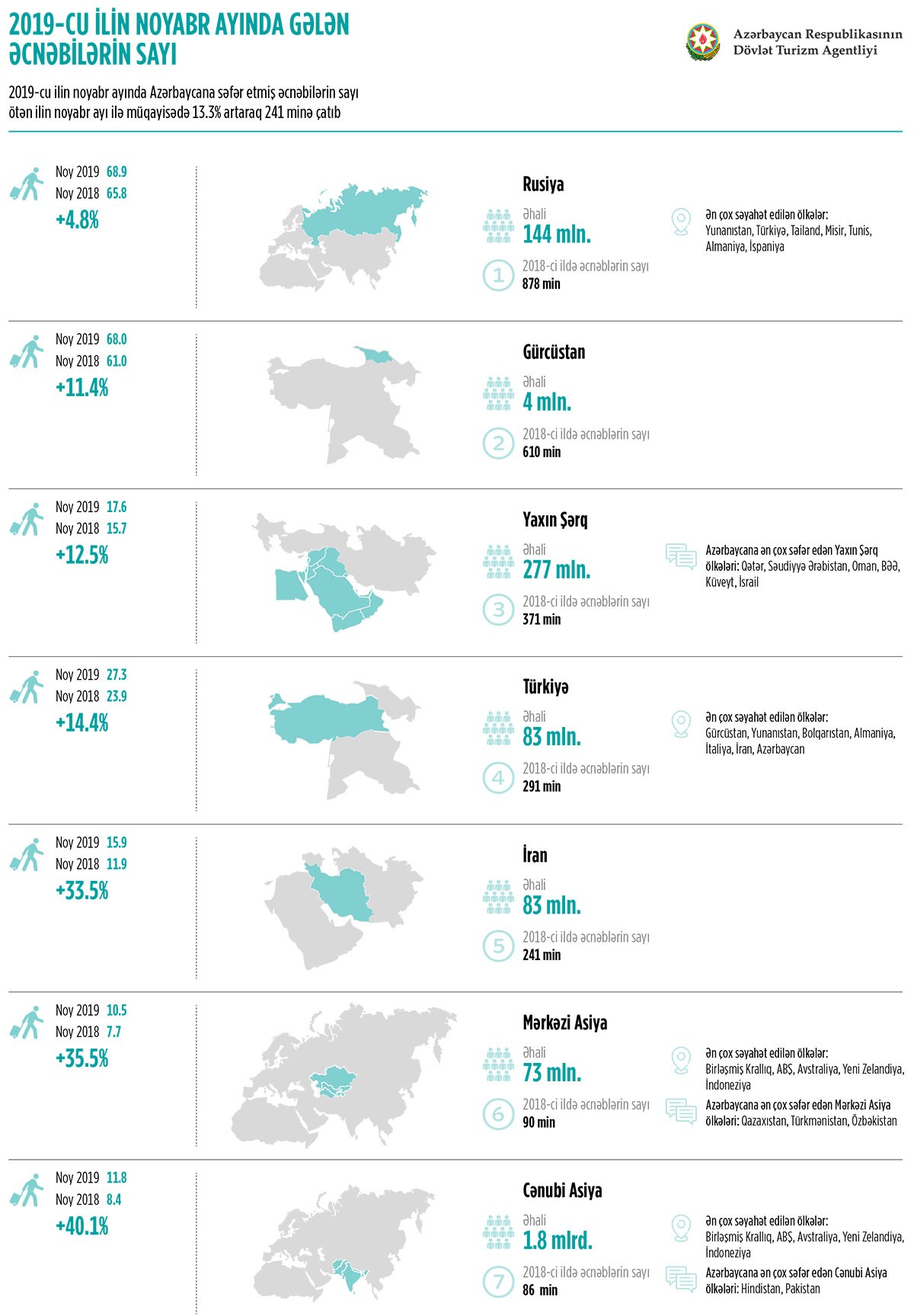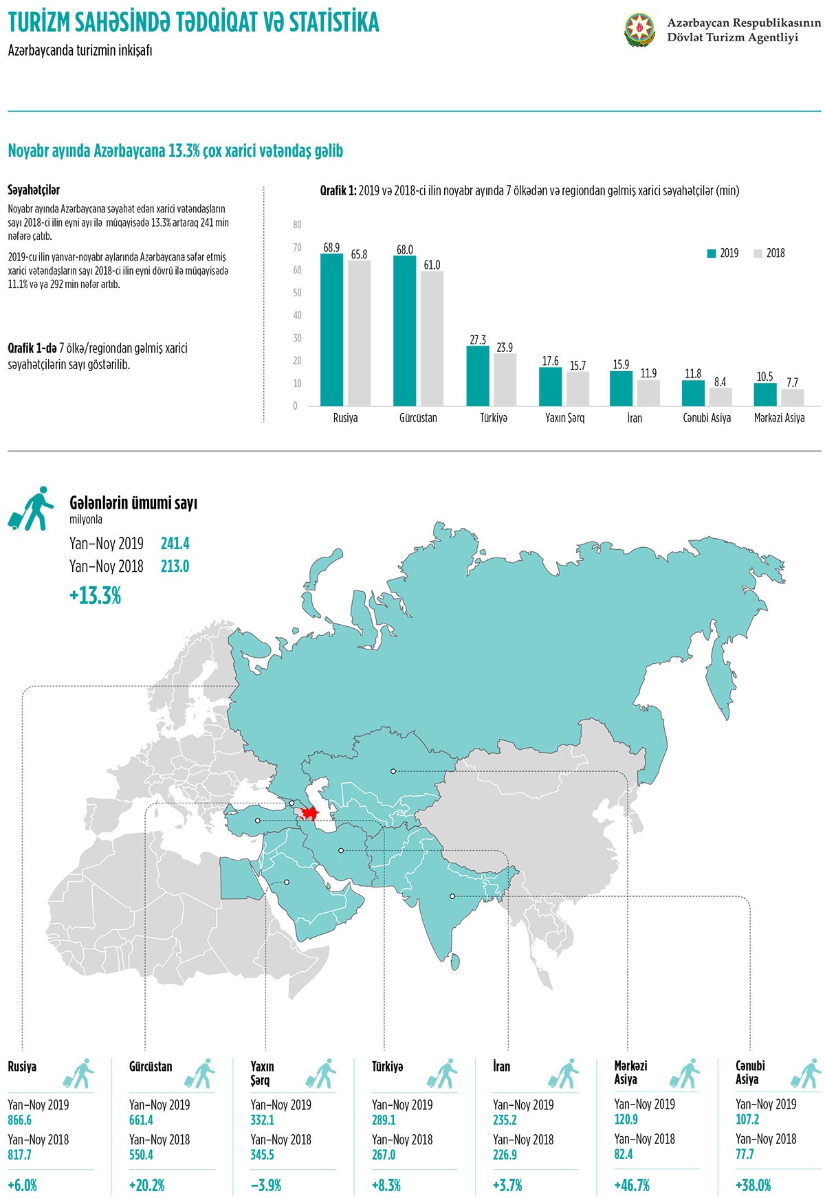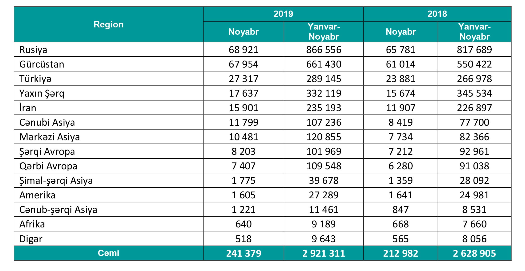 2019-cu ilin yanvar-noyabr aylarında Azərbaycana səfər etmiş xarici vətəndaşların sayı 2018-ci ilin eyni dövrü ilə müqayisədə 11.1% və ya 292 min nəfər artıb. Bu artım da 2017-ci ildən 2018-ci ilə olan artımdan 6%, təqribən iki dəfə çoxdur. Xarici ölkələrdən gələnlərin üçdə birini Rusiya vətəndaşları təşkil edib. Belə ki, 2018-ci ilin yanvar-noyabr ayları ilə müqayisədə Rusiyadan gələnlərin sayı 49 min və ya 6% artaraq 866 min nəfər olub. Ən yüksək artım müvafiq olaraq 20.2%, 46.7% və 38% daha çox Gürcüstan, Mərkəzi və Cənubi Asiya ölkələrindən müşahidə edilib.