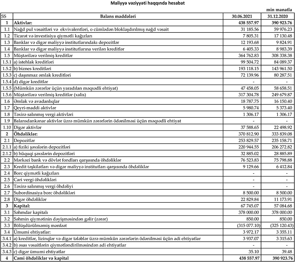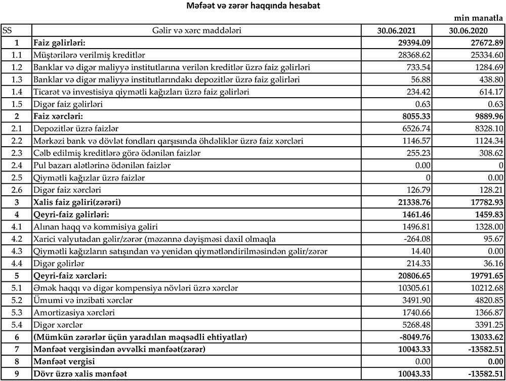 “Yelo Bank” ASC 2021-ci ilin 1-ci yarısını 10 milyon 43 min manat xalis mənfəət ilə başa vurub. Halbuki, Bank ötən ilin eyni dövründə 13 milyon 583 min manat xalis zərər etmişdi. Mənfəətin 80%-i ehtiyat fondundan azad olmuş vəsaitin hesabınadır. Ehtiyat fondundan vəsaitin blokdan çıxması kredit riskinin azaldığına işarədir. Eyni zamanda, Yelo Bankın kredit portfeli böyüyüb, gəlirləri artıb.