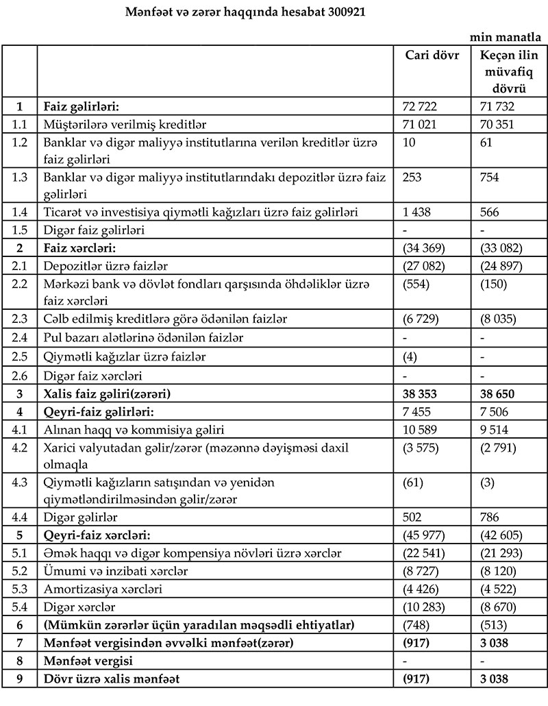 2021-ci ilin 9 ayında “AccessBank”ın cəmi əməliyyat gəlirləri (faiz və qeyri-faiz gəlirləri) 80 milyon 177 min manat, cəmi əməliyyat xərcləri (faiz və qeyri-faiz xərcləri) 80 milyon 346 min manat, xərclər gəlirləri üstələdiyindən əməliyyat zərəri 169 min manat təşkil edib. Bank mümkün zərərlər üçün yaradılan məqsədli ehtiyatlara 748 min manat ayırdığından cari ilin 9 ayını 917 min manat xalis zərər ilə başa vurub.