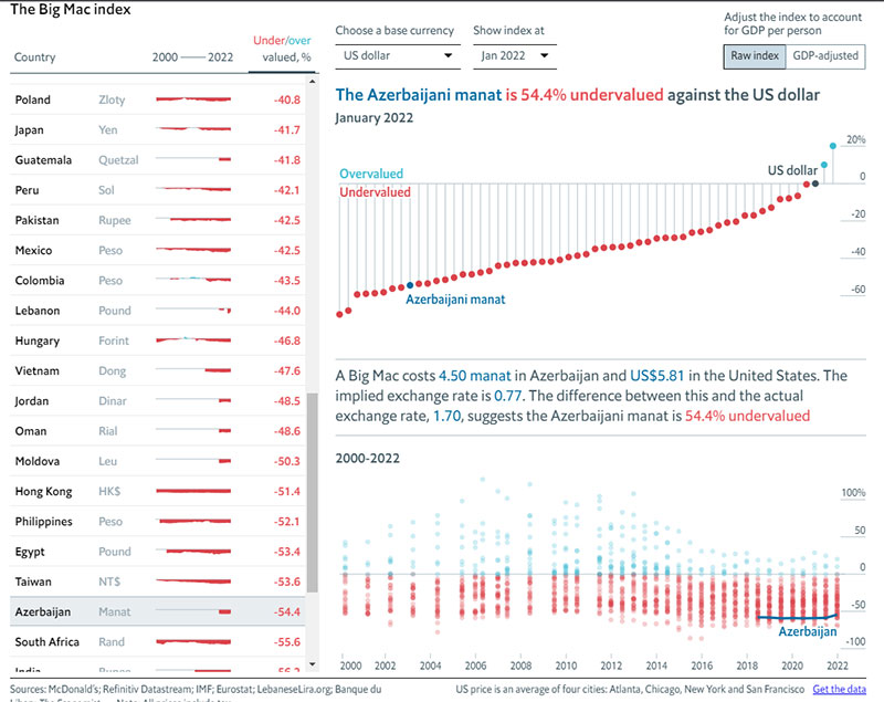 "Big Mac" indeksinə görə, manat dollar qarşısında ucuz qiumətləndirilib. İndeksdən belə çıxır ki, 1 manat 1,30 dollara bərabər olmalıdır. Bu gün isə 1 manat 0,59 dollar bərabərdir."The Economist" jurnalının dərc etdiyi "Big Mac" indeksinə görə, Azərbaycan manatı lazımi səviyyədə qiymətləndirilməmiş valyutalar siyahısında dördüncü yerdən doqquzuncu yerə enib.