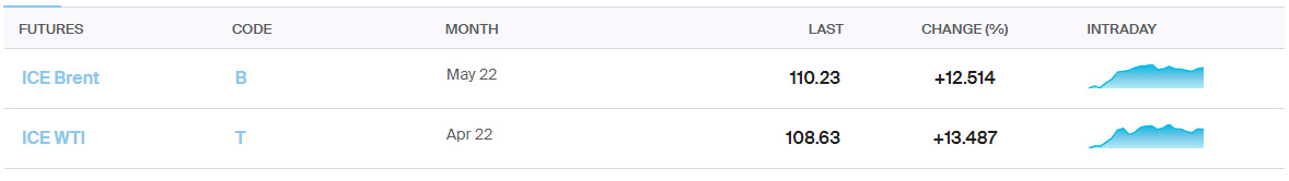 Rusiya-Ukrayna müharibəsinin təsirilə bahalaşan neft qiymətlərindəki "ralli" davam edir. Brent markalı neftin qiyməti 2014-cü ilin avqustundan bəri ilk dəfə olaraq 111 dolları keçib. Beynəlxalq Enerji Agentliyindən vəziyyətin ciddi olduğu barədə məlumat verilib.Rusiyanın Ukraynaya müdaxiləsi və sonra elan edilən sanksiyalar ilə əlaqədar olaraq Brent nefti 110 dolları, ABŞ xam nefti 108 dolları keçib. Brent nefti 12%-dən çox, ABŞ xam nefti isə 13%-dən çox bahalaşıb. Brent neftinin qiyməti 111,06 dolları da test edib.