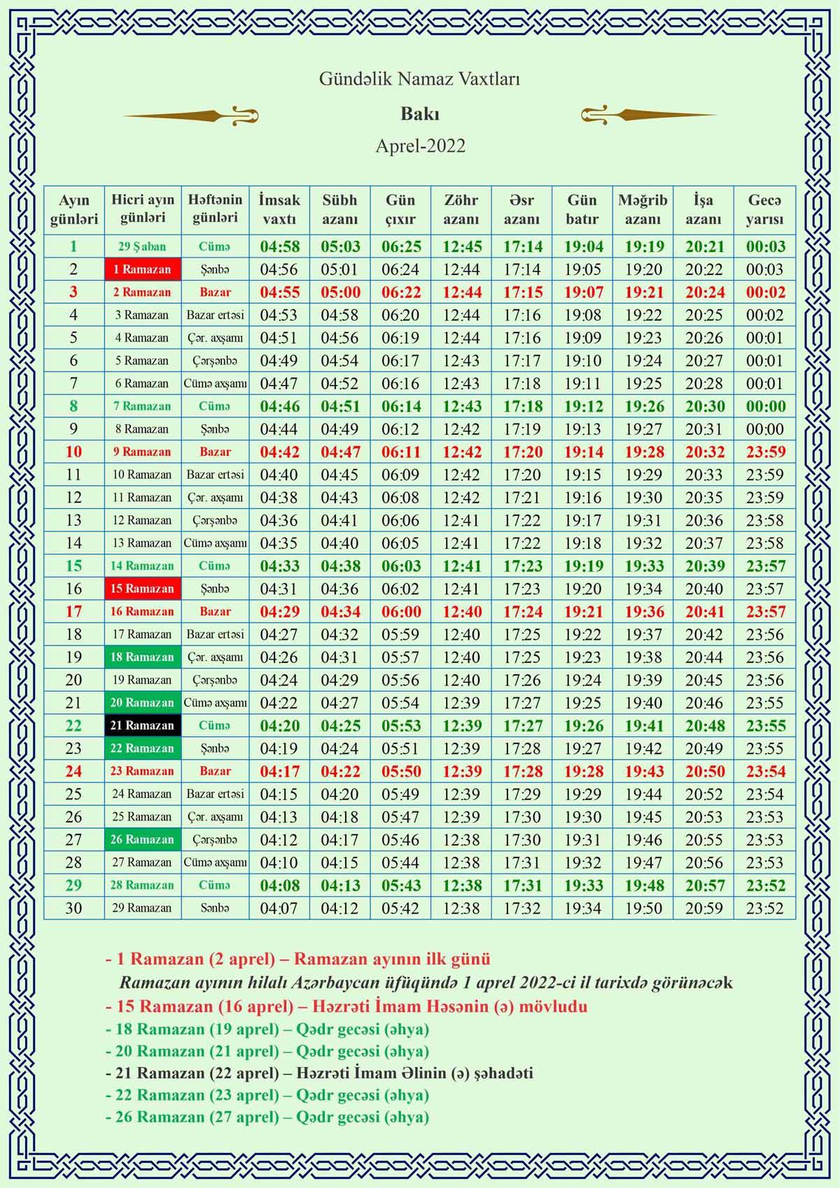 Təqvimə əsasən Ramazan ayı aprelin 2-si başlayacaq.
