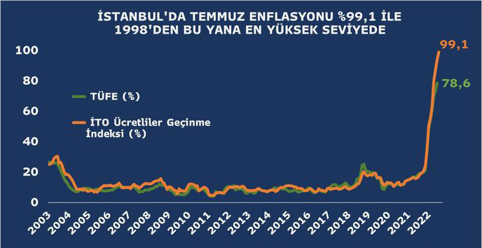 İTO-nun açıqladığı pərakəndə satış qiymətləri indeksi iyulda illik müqayisədə 99,11 faiz artıb. Beləliklə, bu indeksdə illik dəyişiklik 1998-ci ilin fevralından bəri ən yüksək həddə çatıb.