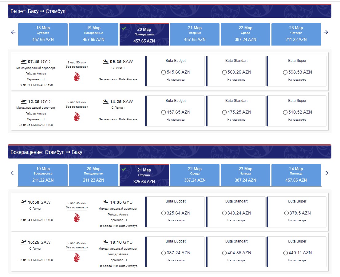 Məlumata görə, 4 ay sonraya – martın 20-21-i tarixlərinə Bakıdan İstanbula (Sabiha Gökçen) bilet almaq istəyənlər bir tərəf üçün 598.53 AZN ödəməlidirlər. Bu tarixlərdə gediş-dönüş isə 1000 AZN-dən yuxarı məbləğə başa gəlir. Həmçinin “Buta”da “standart” bilet 563.26 AZN, “budget” isə 545.66 AZN-dir.