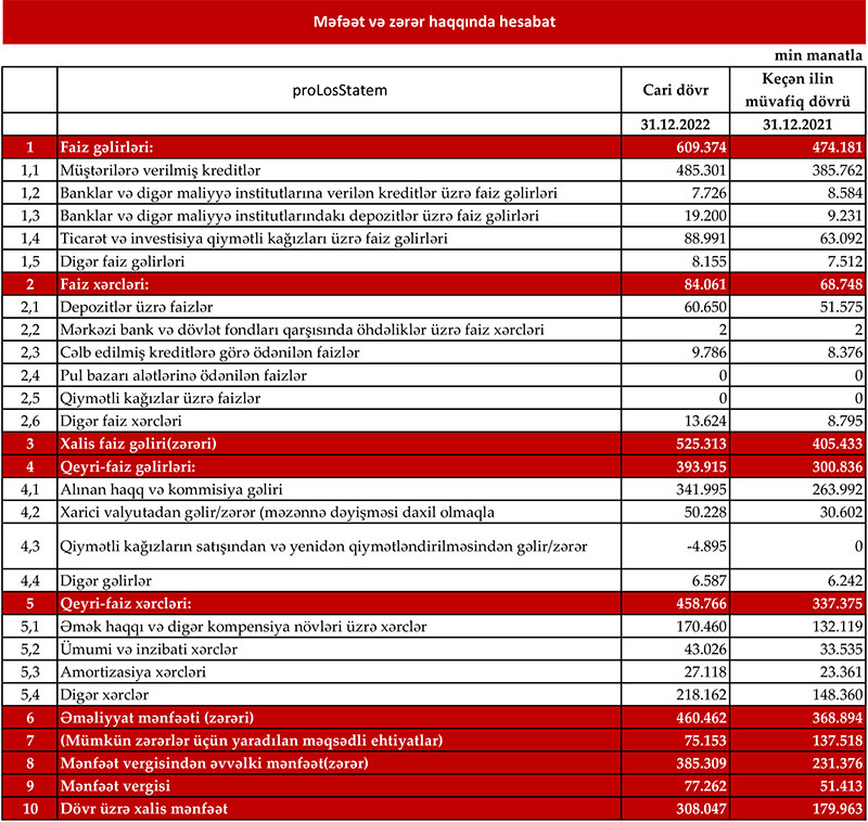 Marja.az xəbər verir ki, “Kapital Bank” 2022-ci ili 308 milyon 47 min manat xalis mənfəət ilə başa vurub. Bank 2021-ci ili 179 milyon 963 min manat xalis mənfəət ilə bağlamışdı. Beləliklə, “Kapital Bank”ın xalis mənfəəti 2021-ci illə müqayisədə 2022-ci ildə 128 milyon 84 min manat və ya 71,2% artıb. Xalis mənfəətin artması həm əməliyyat gəlirlərinin artması ilə əməliyyat mənfəətinin artmasından, həm də,mümkün zərərlər üçün yaradılan ehtiyatlara ayrılan vəsaitin azalmasından qaynaqlanır.